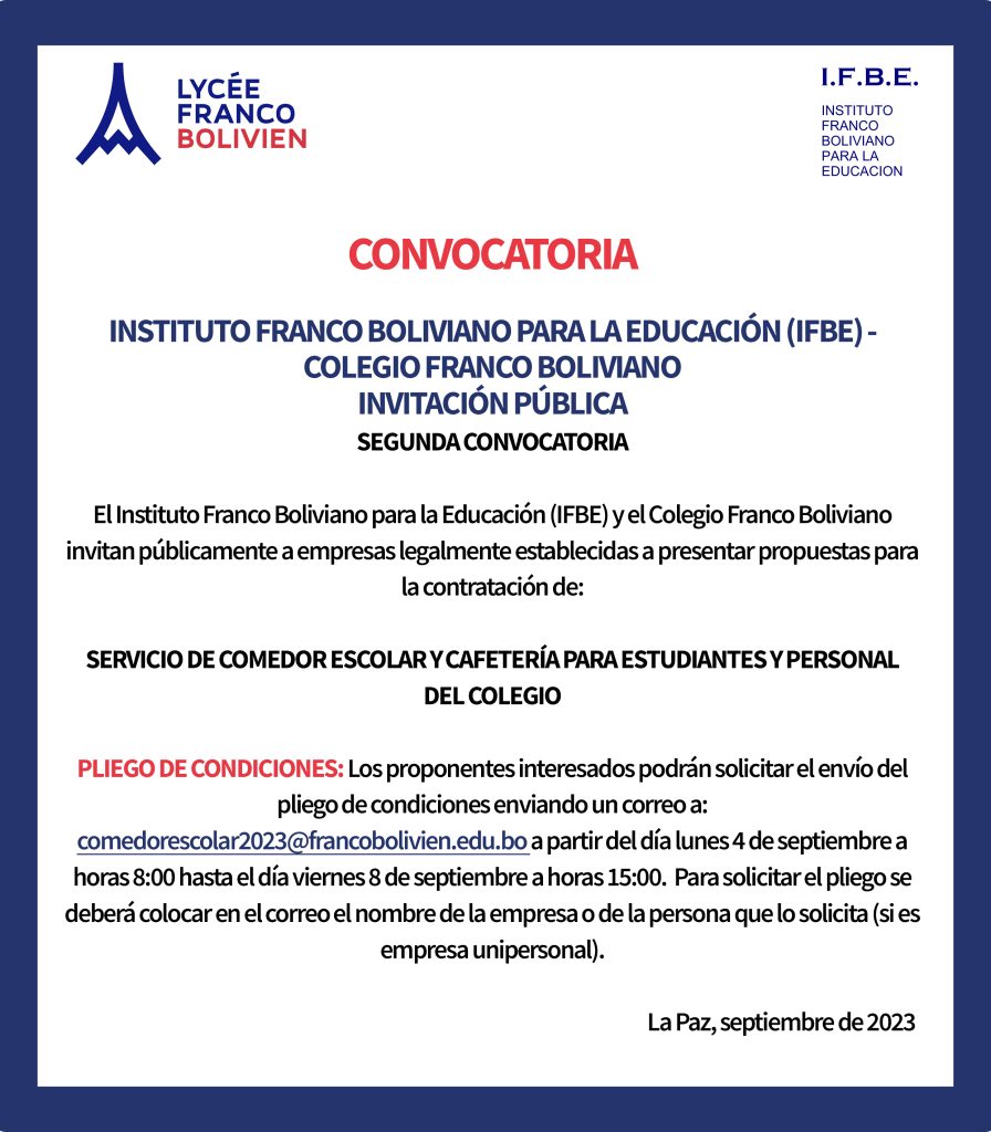 SOLICITAR EL PLIEGO A: comedorescolar2023@francobolivien.edu.bo