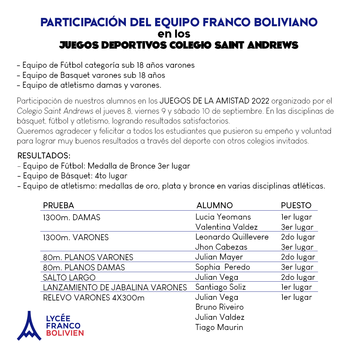 Nuestros queridos estudiantes participaron de los Juegos de la Amistad 2022 organizado por el colegio Saint Andrew’s.Recordamos su buen desempeño compartiendo los resultados. ¡FELICITACIONES A TODOS LOS PARTICIPANTES!Read More